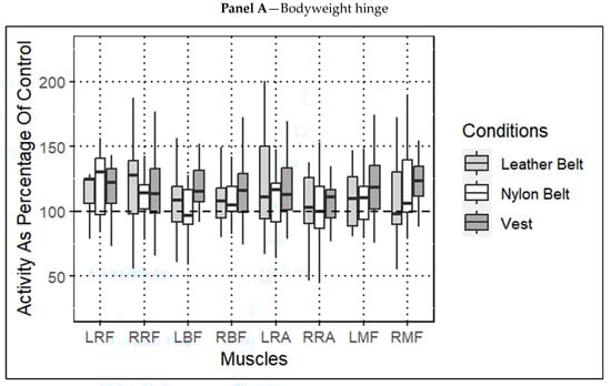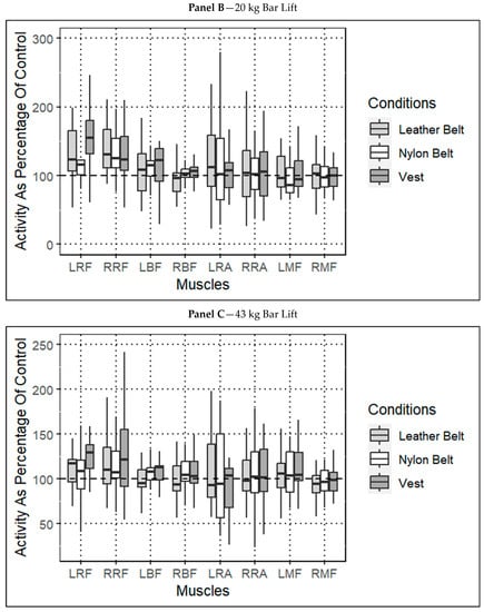 Following data collection, sEMG data were full-wave-rectified and bandpass-filtered (20 to 490 Hz) with a 4th-order Butterworth filter. The sEMG data were then smoothed using the root mean square computation []. Peak muscle activity was then extracted during each trial for each muscle group. The level of sEMG activity for the LEODB and vest conditions was then normalized to the control condition for the 30 s hinging, 20 kg, and 43 kg lifting trials. Lindner and colleagues previously used a similar normalization procedure to compare load conditions to unloaded []. Additionally, this approach supported our primary aim, which was to compare sEMG activity during loaded to unloaded conditions. All sEMG filtering, processing, and calculations were performed in MatLab (MatLab 2020a, MathWorks Inc., Natick, MA, USA).