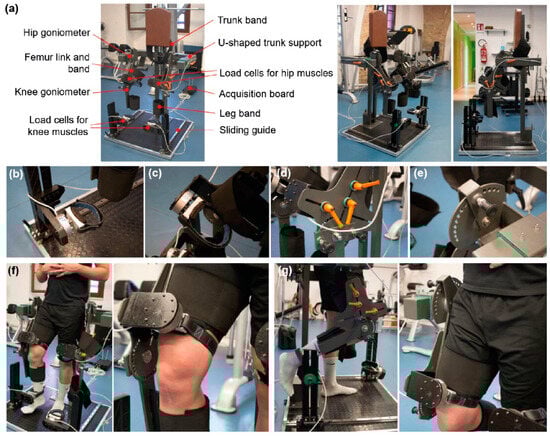 Description of the custom device to measure the isometric force used in this study. Scheme of the instrument with the critical components highlighted and pictures of the device from different viewpoints (a). Zoomed views highlight some essential components of the platform: load cell at the ankle (b); load cells at the knee (c); handles allowing one to adapt the machine dimensions to the subject anatomical characteristics (d); and goniometer to verify the flexion/extension degree of the joint (e). (f) Images of a subject undergoing a knee extensor force measurement test; (g) images of a subject undergoing a knee flexor force measurement test. Reprinted from [33].