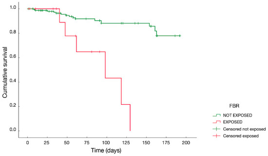 Survival curve of the FBR parameter. The “exposed” group consists of subjects in which the force imbalance between the flexors of the two limbs is higher than 18%. The “not exposed” group includes the subjects not considered at risk of injury, concerning flexor imbalance.