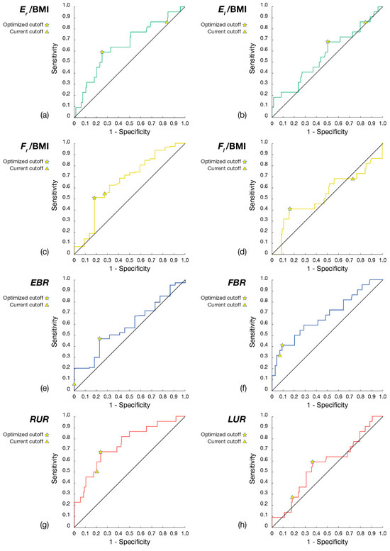 ROC curves of the parameters included in the multivariate analysis, with current and optimized cutoffs highlighted on the graphs: (a) Er/BMI; (b) El/BMI; (c) Fr/BMI; (d) Fl/BMI; (e) EBR; (f) FBR; (g) RUR; (h) LUR.