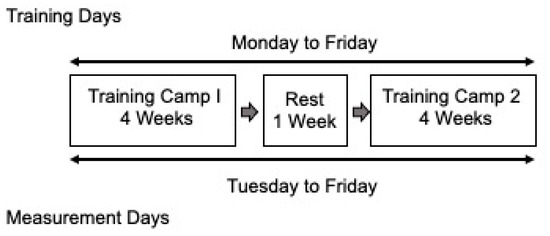 The summer training program ran from the beginning of May to the end of June 2022. This program lasted 9 total weeks with two, 4-week training blocks separated by 1 week of rest. All exercise sessions occurred in the morning between 0600 and 0900. Athletes completed 40 total sessions: 5 consecutive sessions per week. The duration of the sessions averaged 163.5 (±30.8) min and ranged from 90.0 to 240.9 min (~1.5 to 4.0 h). The training load varied daily and between each athlete. All athletes, regardless of position, were exposed to the same strength and power-focused resistance training, speed training (i.e., short-distance sprints), and agility training regimens. Given the prospective nature of this study, no changes in the training programs were made.