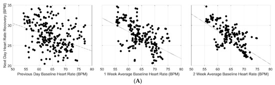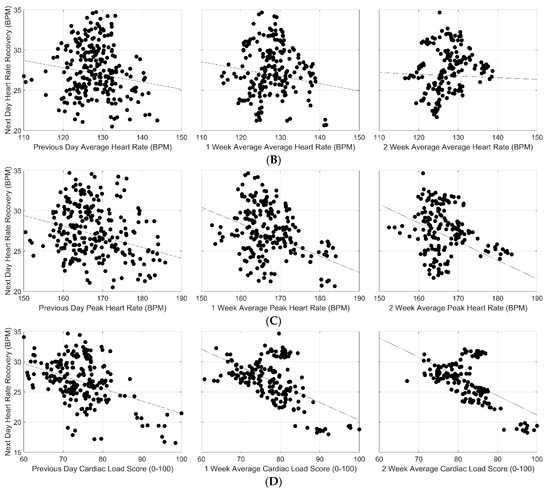 Adjusted linear regression and correlation coefficients representing the associations between several cardiac metrics and next-day HR recovery are presented in Table 2. For baseline HR, a statistically significant negative association with next-day recovery was observed with an increasing magnitude (β range: −0.42 to −0.23; p < 0.0000) in the slope of this relationship for both daily and weekly exposures to exercise training. Statistically significant negative associations were also observed for average HR (β range: −0.09 to −0.02; p < 0.0000) and peak HR (β range: −0.23 to −0.13; p < 0.0000) and next-day HR recovery, albeit lower in magnitude compared to baseline HR. These associations were shown across both daily and weekly exposures to training sessions with a progressive increase in magnitude of the slope observed only for peak HR. Interestingly, exercise cardiac load (total heart beats occurring during a single training session) exhibited the strongest, statistically significant negative association with next-day HR recovery following a 2-week exposure to training sessions, with longer exposures resulting in greater decreases in next-day HR recovery. Like peak HR, the magnitude of the relationship between exercise cardiac load and next-day HR recovery progressively increased across both daily and weekly exposures to exercise training (β range: −0.26 to −0.28; p < 0.0000). Graphical representations of these relationships appear in Figure 2A–D.