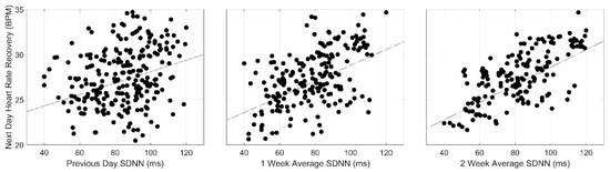 Linear Associations Between Previous Day, 1- and 2-Week Heart Rate Variability, and Next-Day HR Recovery. rMSSD (top) and SDNN (bottom).