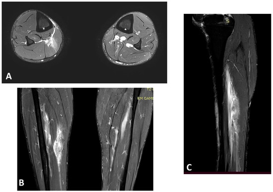 Magnetic resonance imaging (MRI) of a right soleus injury (3B lesion) in a 45-year-old professional football player: (A) axial T2 spectral attenuated inversion recovery (SPAIR) image; (B) coronal T2 SPAIR image; (C) sagittal T2 SPAIR image.