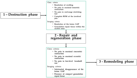 The muscle tissue repair process is completed in a period that depends on the severity of the lesion. During this period, different well-defined biological phases are involved. Each of these phases must be characterized by a definite type of muscular contraction consistent with the biological condition observed within the injured area. Although rehabilitation is subdivided into a defined number of steps, the duration of each step is different, and progression is not time-based but is based on clinical, functional, and imaging criteria [33]. Therefore, the duration of each phase is consistent with the dynamics of the healing processes occurring in the muscle tissue and with the severity of the injury (Figure 2).