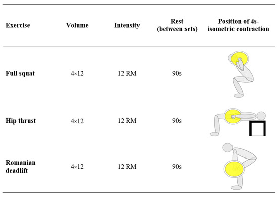 The participants were randomized into an EG and a CG by assigning them a progressive number from 1 to 16, with no repetitions. The generation of a random number list was performed using an online software (https://www.random.org/sequences/ (accessed on 17 June 2023), Dublin, Ireland). The list was used to allocate the participants in a random order to the different groups in blocks of two participants per group, following the sequence EG–CG. After randomization, the homogeneity of the two groups was evaluated based on the assessed outcomes. A familiarization session was performed one week before the intervention to make the participants accustomed to the electric stimuli. Both EG and CG training protocols consisted of 3 voluntary strength exercises: full squat, hip thrust and Romanian deadlift. The participants were asked to calculate their 12RM the week before the intervention, supervised by a specialized trainer. After 10 min of warm-up, each exercise was performed in 4 sets with 12 repetitions, with 90 s of rest between the sets and 2 min of rest between the exercises [25]. During each repetition, 4 s of stimulation occurred during the isometric contraction at the point of transition between the eccentric and the concentric phases of the movement; the following 4 s without stimulation were used to return to the initial position (2 s) and then reach the isometric position again (2 s) for the subsequent 4 s of stimulation. The 4 s of stimulation during the isometric phase were programmed to coincide with specific positions during each exercise. The impulse was administered at the point of maximum squatting during the squat, at the point of maximum hip extension during the hip thrust and at the point of maximum hip flexion during the Romanian deadlift. This approach aimed to maximize muscle activation in specific phases of the movements. The training protocol is shown in Figure 1. The EG performed the protocol with the superimposition of WB-EMS (rectangular stimulation at 85 Hz, 350 µs, 4 s stimulation/4 s rest) [26]. The participants were encouraged to exert a maximum effort during the WB-EMS impulse. To ensure an optimal recovery phase, the stimulation was paused during the recovery periods between sets and exercises [26]. However, the effective duration of the training was planned, in relation to exercise volume and intensity, to reach a total of 20 min of stimulation (including both “on” and “off” periods), avoiding the risk of developing contraindications associated with prolonged stimulation. To generate a sufficient but tolerable intensity, the stimulus was set to reach a level of 6–7 out of a maximum of 10 on the Borg CR10 scale measuring the rate of perceived exertion (RPE) [27]. The control group followed the same training protocol without the superimposition of WB-EMS.