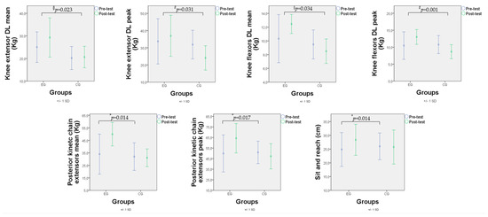 RM-ANOVA performed on the posterior kinetic chain extensors’ mean and peak measurements showed a significant effect of time (F(1,14) = 7.932; p = 0.014; η2p = 0.362 and F(1,14) = 7.294; p = 0.017; η2p = 0.343, respectively), with the experimental group significantly increasing the strength performance compared to the pre-assessment measurement (p = 0.001 and p < 0.001, respectively). In addition, a significant time*group interaction was found (F(1,14) = 10.036; p = 0.007; η2p = 0.418 and F(1,14) = 20.719; p < 0.001; η2p = 0.597, respectively). No significant differences were found between the groups (F(1,14) = 3.769; p = 0.056; η2p = 0.236 and F(1,14) = 1.488; p = 0.243; η2p = 0.096, respectively).