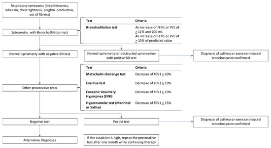 Provocation to Assess Bronchial Responsiveness or Challenge Tests: Bronchoprovocation challenges can be categorized into two distinct types: direct and indirect. Direct challenges, such as methacholine and inhaled histamine testing, are considered more accurate in assessing BHR in asthma and EIBA. In contrast, indirect challenges encompass exercise, eucapnic voluntary hyperpnea (EVH), hypertonic saline, inhaled adenosine monophosphate (AMP), and inhaled mannitol powder tests. These indirect challenges closely simulate the effects of exercise and are often regarded as more precise in diagnosing EIBwA [32,38]. However, the associations between exercise tests and other indirect bronchoprovocation tests are currently a subject of debate and exhibit variations, which depend on the specific test in question [39].