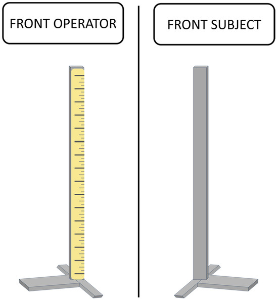 SP and PSJ were assessed by means of a custom-made vertical graduated rod, measured in centimeters (cm). SP, defined as the participants’ subjective expectancy in jump height measure, was assessed only before the first jump, asking each participant to predict the maximum height they could achieve in an SJ by marking it on. PSJ, defined as the participant’s self-perception in the height measure of the SJ performed, was assessed after each SJ trial, hence having experienced the execution, asking each participant to evaluate the perceived SJ height achieved in each performance. For both measurements, participants were asked to physically mark their predicted and perceived SJ height on the vertical graduated rod, illustrated in Figure 2, by simply pointing at it, transforming their SP and PSJ in a measurable (cm) outcome. To ensure both unbiased data collection and an uninfluenced response by external feedback, only the investigator had access to the gradations on the rod.