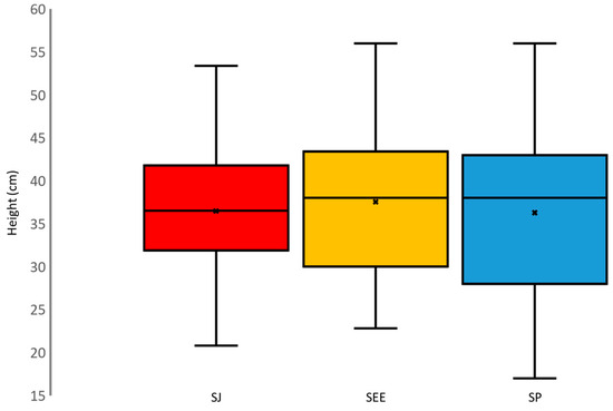Boxplots of the distribution of SJ height measurements obtained during the SJ (in red), SSE (in yellow), and SP (in blue).