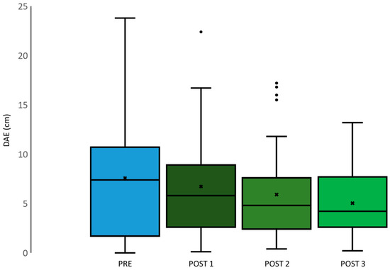 Boxplots depict distribution of DAE, PRE (light blue), POST 1 (dark green), POST 2 (green), and POST 3 (light green).