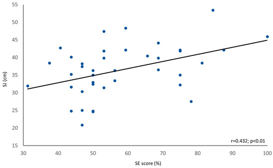 Pearson’s analysis showed a positive correlation between the self-reported percentile (Q7) and SJ percentile (r = 0.427; p = 0.007). The SE score exhibited significant correlations with both the SJ (r = 0.432; p = 0.006) (see Figure 6) and the SP (r = 0.441; p = 0.005) (see Figure 7). The SEE exhibited significant correlations with both the SJ (r = 0.440; p = 0.005) and the SP (r = 0.463; p = 0.002).