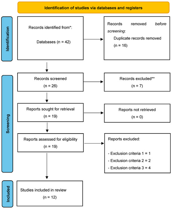 A total of 42 original articles were found, of which 16 were duplicates. Thus, a total of 26 unique articles were identified. After checking titles and abstracts, seven articles were excluded because they did not meet inclusion criterion number five. The full text of the remaining 19 articles was then analyzed; one article was excluded because it did not meet inclusion criterion number one, two articles were excluded because they did not meet inclusion criterion number two, and four articles were excluded because they did not meet exclusion criterion number three. Thus, a total of 12 articles met all of the inclusion criteria and were included in the final qualitative synthesis (Figure 1).