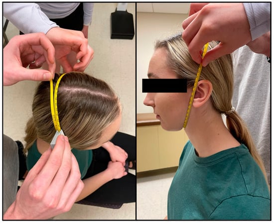 Face girth (FG) is the maximum circumference from under the chin to the vertex of the head [6]. The tape was placed immediately superior to the hyoid bone where the neck and chin meet and wrapped up the sides of the face (using the tragion as a landmark) to the vertex of the head. To ensure a proper measurement, the tape needed to be equidistant in relation to the tragion on each side of the head (Figure 2). FG was taken by two technicians, one standing behind the seated participant, with the second moving around the participant to ensure that the measuring tape was level and crossed all relevant landmarks. Two measurements were taken and measured to the nearest millimeter (mm) by two different trained technicians. A third measurement was taken if the measurements between the technicians differed by more than 5 mm. On the rare occurrence no two measurements were within 5 mm, a fourth trial was taken. The average of two FG measurements within 5 mm was used in predicted head volume equations (see Equations (1) and (2)).