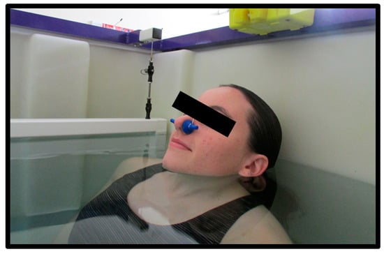 Each participant showered to wash off any lotions or deodorants prior to entering the water tank. The tank used was approximately 3.5 ft by 4.75 ft and 3.5 ft in depth and water temperature was maintained between 31–34 °C. The participant then entered the tank to be weighed. The computer program used was designed specifically for hydrostatic weighing (HW) (HydroDensity software version HD2, EXERTECH®—Dresbach, MN, USA). Instructions for the hydrostatic weighing procedure were verbally explained in detail to each participant. Participants were asked to brush off any air bubbles that were trapped in their tight-fitting clothing or hair. Participants first completed total lung capacity (TLC) trials with the head above water (HAW) and the head below water (HBW). Due to the increased buoyancy with TLC, all participants wore a 2.1 kg weighted belt worn around the waist. They were instructed to keep their shoulders below the level of the water to prevent overloading the weighing system and reduce perturbation of the water for the most accurate results. A nose clip was secured to each participant to prevent air leakage through the nasal passage. For TLC trials, the participants were instructed to position their head so the tips of the earlobes and the inferior surface of the chin were in line with the level of the water (Figure 3). The participants inhaled as much as they possibly could and were instructed to hold this position above water for 3 s. Following the 3 s above water, the participants bent forward at the waist to fully submerge themselves below the water at the same lung capacity. Once below the water, the participants remained underwater for 5 s on their count. This procedure constituted one trial, where their weight was measured with their head above and below the water at the exact same lung volume (TLC). Participants completed hydrostatic weighing at TLC until 3 trials within 100 g (for HAW and HBW) were recorded with a maximum of 7 trials. Technicians recorded the participant’s weight for HAW and HBW in kilograms from the EXERTECH® computer system by selecting 100 ± 2 samples which best represented the mean weight with head above and head below water [6]. The average of three weights, for both HAW and HBW, within 100 g were used for analysis.