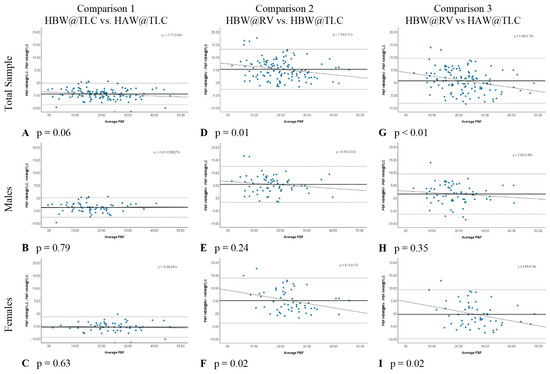 In comparison 3, both head position and lung volume changed (HBW@RV and HAW@TLC). HAW@TLC yielded statistically significantly lower mean PBF measurements for males (p-value = 0.003) but no statistically significant difference overall (p-value = 0.175) or for females (p-value = 0.389, Table 3). Although there was a statistically significant difference for males, this difference was only 1.5% lower mean PBF from HAW@TLC; this difference is not clinically significant. The Bland-Altman Plot for males (Figure 4H) demonstrated there was no evidence that the difference in calculated PBF with a change in lung volume and head position was statistically significantly related to PBF (p-value for proportional relationship = 0.347). Figure 4I seemed to suggest proportional disagreement in females’ PBF from HBW@RV and HAW@TLC (p-value for proportional relationship = 0.017); however, this statistically significant relationship was driven by an outlying participant with low PBF. Omitting this outlier resulted in a no-longer-significant relationship between the difference in these estimates and the average PBF (p-value with outlier removed = 0.055). In Figure 5G–I LCCC values are >0.8 overall and separately for males and females, indicating the percent body fat values have very strong concordance when using the standards of interpretation for Pearson’s correlation coefficient.