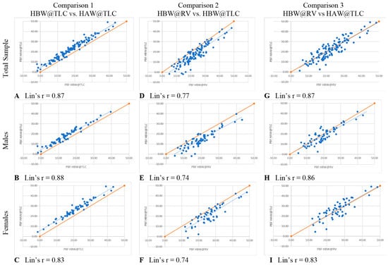 In comparison 2, separately for males and females (Table 3). The Bland-Altman plots (Figure 4D–F) demonstrated that the difference in calculated PBF with a change in lung volume was statistically proportional for females (p-value for proportional relationship = 0.019, Figure 4F), but not for males (p-value for proportional relationship = 0.236, Figure 4E), thus driving the overall proportional bias (p-value for proportional relationship = 0.012). Specifically, overall and for females, HBW@RV appeared to yield higher PBF estimates than HBW@TLC for people with less body fat, and lower estimates for people with higher body fat. Figure 5D–F further illustrate that these two measures had the greatest amount of discordance with Lin’s CCC between 0.72–0.77, demonstrating that changing lung volume affects calculated percent body fat, even with the head below water.
