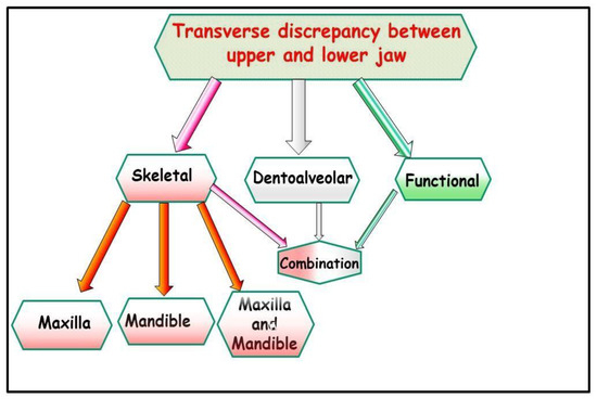 There are several causes for the transverse discrepancy between the upper jaw and lower jaw, indicating a narrow upper jaw, bilateral crossbite, unilateral crossbite with or without facial asymmetry (Figure 1).