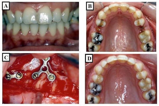 Images of a patient who underwent dental expansion of the upper jaw and an upper jaw osteotomy. (A,B) show the case before the treatment, while (C,D) show during the operation on the upper jaw; fissures in the bone were observed. This is associated with dental and alveolar expansion.