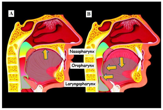 Illustration of tongue position and airways. (A) shows the physiological tongue position in a normally wide upper jaw on the palate (The yellow arrow indicates the direction of position on the palate). In this tongue position, the airways are most open, and usually, there are no breathing disturbances through the nose. (B) shows the case of a narrow upper jaw; the tongue rests on the floor of the mouth (Yellow arrow directed caudally), pushing the tongue posteriorly (Yellow arrows directed posteriorly). This constriction particularly affects the airways in the area of the laryngopharynx, leading to impaired nasal breathing.