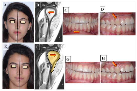 In this situation, two different occlusions with two different condyle positions can be observed—a habitual occlusion with a habitual condyle position and a centric occlusion with a centric condyle position. Typically, facial asymmetry is observed in habitual occlusion or the habitual condyle position. Manual functional analysis can achieve the centric condyle position with the corresponding change in occlusion. This helps reduce or completely eliminate facial asymmetry. A dentoalveolar malalignment is often involved in most cases (Figure 8A–H).