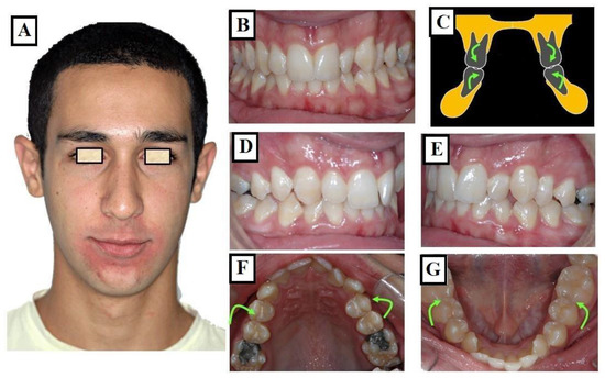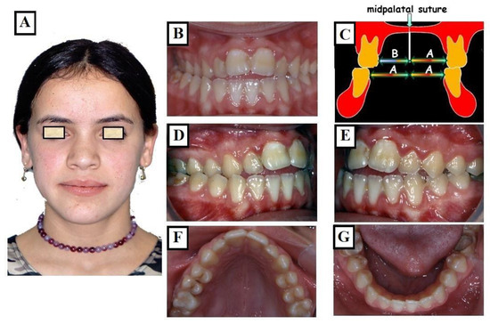 Transverse discrepancy between the upper jaw and lower jaw without facial asymmetry (A), crossbite on both right and left sides (B,D,E). The overall upper jaw is narrow (C,F), and the lower jaw is well-formed (G), the width of the maxilla, which consists of two halves that are equally wide (C arrows 2 × B), is narrower than the width of the mandible (C arrows 2 × A) partially adapting to the width of the upper jaw.