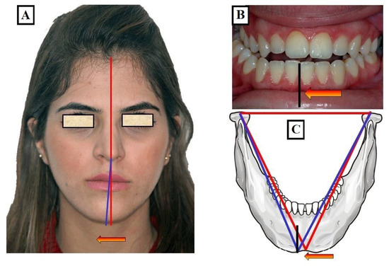 Transverse discrepancy between the upper jaw and lower jaw with facial asymmetry to the right deviation of the mandible to the right (red arrow, blue line) from the midline of the face (red line) (A) with a crossbite to the right (Black line and red arrow) (B), a minor skeletal or growth-related deviation of the lower jaw (red arrow, blue line) (C).