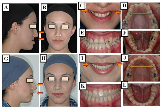 The configuration and balance of the maxillary arch, the contour of the palatal vault, occlusion, the primary respiration pattern (i.e., nasal or oral), and the width of the oral passage during grinning were all assessed for clinical purposes. A transverse insufficiency in the maxilla can be detected by hollowing out the paranasal area, widening the buccal corridors excessively, deepening the nasolabial region, or reducing the width of the alar bases (Figure 15A–L). The modest soft tissue alterations linked to sexually transmitted diseases could make diagnosis more challenging. Therefore, the primary symptoms are pronounced crowding, rotation, or buccal/palatal displacement of the teeth, lateral/medial tooth misalignment, crossbite on one or both sides, an elevated palatal vault, and occlusions exhibiting an hourglass or V-shaped pattern. One of the causes of sexually transmitted diseases is mouth breathing. As a result, in otolaryngology practice, the aforementioned findings are sometimes noticed. Patients with STDs need to be assessed for mouth breathing and referred as needed to the relevant specialty. Excessive vertical dimension of the maxilla, coupled with a mandibular prognathic relationship, Apertognathic malocclusion (skeletal and/or dentoalveolar open bite), and corrected cleft palate are examples of dentofacial malformations linked to STDs. A physician can initially diagnose transverse insufficiency using these visual cues [34,43,44]. After closure, the mandibular shift needs to be evaluated. A frontal face examination may reveal lateral chin deviation; if this is the case, the underlying cause must be found. This can be the result of real bone asymmetries or a functional movement away from centric relation. If there is any doubt about the lateral displacement, it is best to temporarily disarticulate the occlusion for a period of one to two weeks, then have another examination done. Bite plates can be used for this. Here, the patient’s compliance could be in question, especially in the case of younger children. In this situation, the occlusion can be disarticulated, and a lateral displacement can be examined by inserting and gently activating a fixed (Hyrax) expander. It is imperative to notify all relevant stakeholders, including parents and patients, that therapy perhaps not definitively initiated unless the presence or absence of a lateral shift has been confirmed. Unilateral chin and crossbite asymmetry is used to suggest real unilateral skeletal asymmetry if a lateral shift is not observed [28].