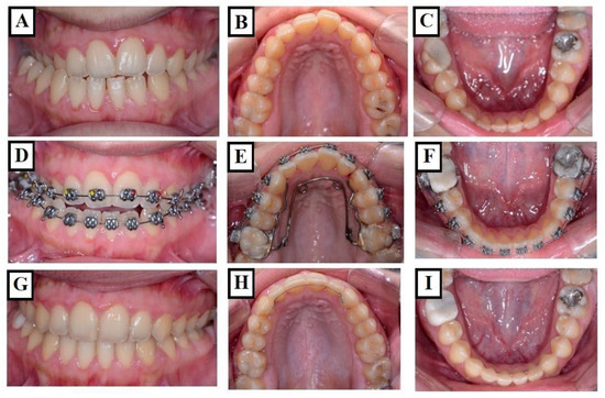 Orthodontic expansion using a fixed appliance—Quadhelix. (A–C): Before treatment, the upper jaw is narrow with a right-sided crossbite and well-formed mandible. A Quadhelix appliance was used for the expansion of the upper jaw (E) and during treatment (D–F). Situation after treatment (G–I).
