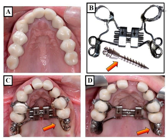 Expansion of the narrow upper jaw (A) with the MARPE (Miniscrew-Assisted Rapid Palatal Expander). (A–D) show the case before expansion, the expansion device in combination with mini-implants (red arrows), before activation of the device, and finally (D) after the expansion of the upper jaw, respectively.