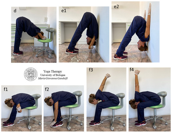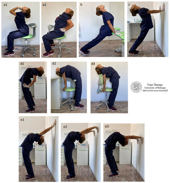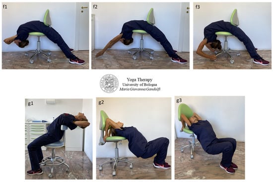 Āsana in Figure 3 display Upavistha Anuvittāsana (Seated Backbend Pose) with hands in Mushti Mudra (Fist Gesture) who put pressure against the chin to favor neck extension (Figure 3(a1)) or hand palms are pushing the sacrum to favor low-back extension (Figure 3(a2)), Bhujangāsana (Cobra Pose) (Figure 3b), Urdhva Mukha Svanāsana (Upward Facing Dog) standing (Utthistha) variation (Figure 3c), Anuvittāsana (Standing Backbend Pose) and variations (Figure 3(d1–d3)), Chakrāsana or Urdhva Dhanurāsana (Full-Wheel Pose or Upward Bow Pose) (Figure 3(e1–e3)), Dwi Pada Viparita Dandāsana (Two-Legged Inverted Staff Pose) (Figure 3(f1–f3)) and its preparations (Figure 3(g1–g3)).