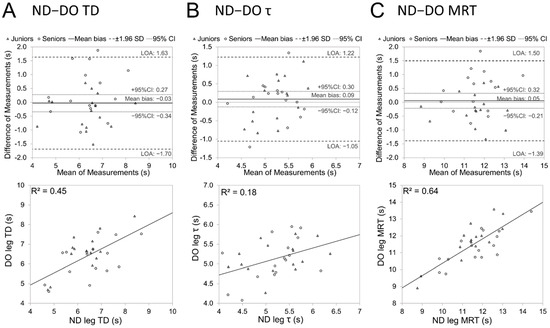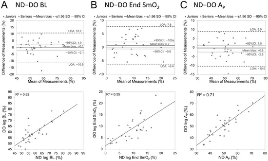 The Bland Altman analysis evaluated the agreement level between ND and DO SmO2 kinetics characteristics on the whole sample and for separate age groups with upper and lower limits of agreement (LOA) at 1.96 SD level. A simple regression analysis and plots were conducted to evaluate agreement in covariation between ND and DO SmO2 kinetics values, and the coefficient of determination (R2) was used to measure the strength of associations.