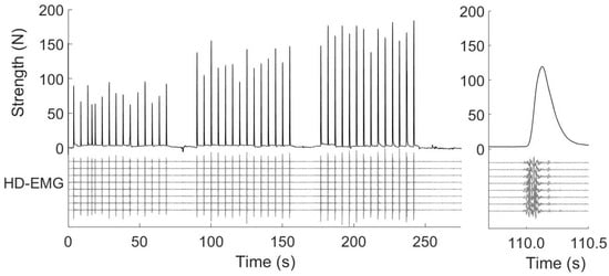 In the left panel, the upper part of the graph shows a representative example of the force signal recorded during the evaluation of the elbow extensor muscles of an amputee subject. The lower part of the graph shows the electromyographic (HD-EMG) signals from one of the four columns of electrodes that are part of the array placed on the triceps brachii (lateral head). In the right panel, the magnification of one repetition is plotted. As can be seen, the active phase of the muscle contraction lasts about 200 ms.