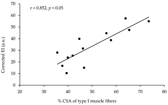 | Type I fibers (%) | 49.4 ± 11.9 | 40.6 ± 6.1 | 59.5 ± 8.3 * | −2.623 |