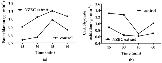 During the 1 h treadmill run, New Zealand blackcurrant extract enhanced fat oxidation by 21% (p = 0.009) (Figure 1a). Carbohydrate oxidation was 31% lower (p = 0.05) (Figure 1b). The respiratory exchange ratio was lower by 0.03 units (control: 0.80 ± 0.02, NZBC extract: 0.77 ± 0.01; p = 0.04).