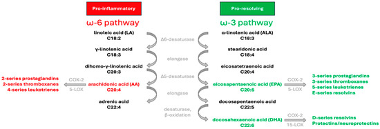 Although they share the same enzymes, there are two distinct pathways for the synthesis of the long-chain ω-3 and ω-6 PUFA, as illustrated in Figure 1. Humans are unable to produce the precursors of these FA families, linoleic acid (18:2ω-6; LA) and α-linolenic acid (18:3ω-3; ALA). The consumption of these essential FA through diet facilitates the synthesis of arachidonic acid (20:4 ω-6; AA), eicosapentaenoic acid (20:5ω-3; EPA), and docosahexaenoic acid (22:6ω-3; DHA) involving elongation and desaturation reactions. These compounds play crucial roles in regulating various homeostatic processes by influencing the production of bioactive signaling lipids known as eicosanoids. However, ω-3 and ω-6 PUFA exert contrasting effects on metabolic functions. Cyclooxygenases-2 (COX-2) synthesizes prostaglandins (PGs) and thromboxane (TXA) of the two-series (A2, E2, I2, and TXA2) from AA, while lipoxygenases (5-LOX) act on AA to produce leukotrienes (LTs) of the four-series (B4, C4, and E4). These eicosanoids derived from AA play various roles in physiological processes, such as promoting inflammation, platelet aggregation, vasoconstriction, and immune responses [7]. Through a similar series of reactions metabolized by the same enzymes, ALA transforms into EPA, from which COX-2 and 5-LOX can metabolize to produce PG and TXA of the three-series (B3, D3, E3, I3, and TXA3), and LT of the five-series (B5, C5, and D6), respectively. The biosynthesis of DHA involves further reactions, including elongation, desaturation, and β-oxidation. DHA can then be metabolized into autacoids like D-series resolvins (RVD1 to RVD6) and protectins (neuroprotectin D1). Mediators derived from EPA and DHA exhibit potent anti-inflammatory properties and act as specialized agents crucial for resolving inflammation [8].