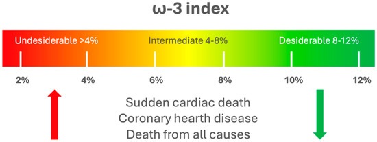 Different methodologies are available for quantifying PUFA levels and their mediators. Common methods include enzyme-linked immunosorbent assays (ELISA) and radioimmunoassays. However, these techniques are limited as they can only measure one metabolite at a time, lack complete selectivity, are prone to cross-reactivity, and apply only to specific lipid types. The latest progress in mass spectrometry (MS) has facilitated the advancement of lipidomics, enabling the concurrent qualitative and quantitative evaluation of a wide array of lipid species, including PUFA. Liquid chromatography (LC)-MS/MS is particularly powerful for PUFA analysis, offering high sensitivity and specificity in the evaluation of a wide array of lipid species [9]. Due to their stability, PUFA indices are often measured in the red blood cell (RBC) membrane, representing the preferred sample type. It exhibits lower variability compared to measurements in plasma, primarily due to the limited exchange between plasma and cells and the incorporation of dietary EPA and DHA in a dose- and time-dependent manner [10,11,12]. However, this method is invasive and costly, requiring complex sample handling. Dried blood spot (DBS) sampling, usually obtained from the fingertip, offers a simpler alternative, allowing for minimally invasive sample collection and easy acceptance by patients. DBS has been validated for PUFA analysis in various studies, demonstrating good correlation and low variability compared to traditional RBC measurements. Despite some limitations, DBS holds promise for large-scale studies and may be suitable for estimating PUFA indices in clinical settings [9,13,14].The concentration of PUFA in blood lipids is commonly used to measure dietary intake and estimate their levels in cell membranes [15]. PUFA levels in whole blood (WB) and RBC mirror the PUFA composition in the cellular membranes of the major organs and tissues [16,17]. The ω-3 index (O3I) is defined by the amount of EPA + DHA in RBC membranes expressed as a percentage of the total RBC membrane FA. O3I was initially proposed as a marker to study the risk of death from coronary heart disease (CHD) [18]. The recommended protective level for O3I is approximately 8%, while levels below 4% are linked to a higher risk of disease (Figure 2). Nevertheless, these thresholds have not yet been confirmed in extensive human studies [9].