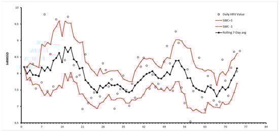 Importantly, HRV has no standardized range as of the current research, meaning there is no agreed upon normal value [4]. Normative ranges exist [15] but cannot be applied with cutoff values for ease of interpretability, especially with an athlete population. Therefore, the terms “higher” or “lower” are all relative to an individual’s baseline HRV. A high HRV relative to baseline represents a healthy, flexible autonomic system and improved adaptability and recovery in response to a changing environment or stressor, such as travel or exercise [1,3,16]. A low HRV relative to baseline represents an imbalanced autonomic function, typically due to a withdrawal of the parasympathetic system, resulting in a sympathetic-dominant state associated with increased inflammation and a greater potential for a cardiac event [1,3,17]. Regardless of high or low HRV, stability of HRV around an individual’s baseline within the smallest worthwhile change window (SWC) is typically considered a long-term goal of training. An SWC has previously been defined as ±0.5 or 1 standard deviations from an individual’s chosen HRV metric [18,19,20,21] (Figure 1).