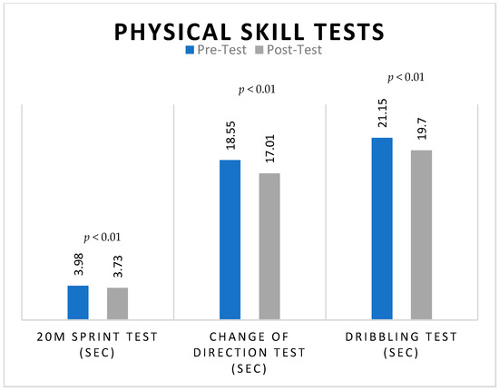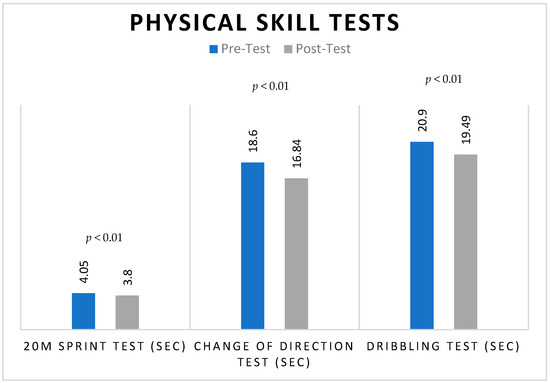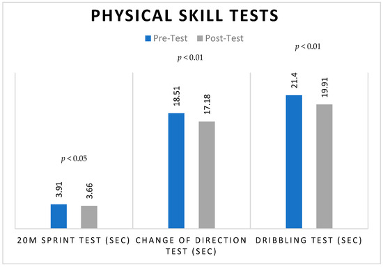 Apart from that, as showed in Figure 3, significant reductions were observed in the 20 m sprint test (pre-intervention: 3.91 ± 0.17; post-intervention: 3.66 ± 0.35), change-of-direction test time (pre-intervention: 18.51 ± 0.59; post-intervention: 17.18 ± 0.66), and dribbling test time (pre-intervention: 21.40 ± 0.76; post-intervention: 19.91 ± 0.74) of soccer players.