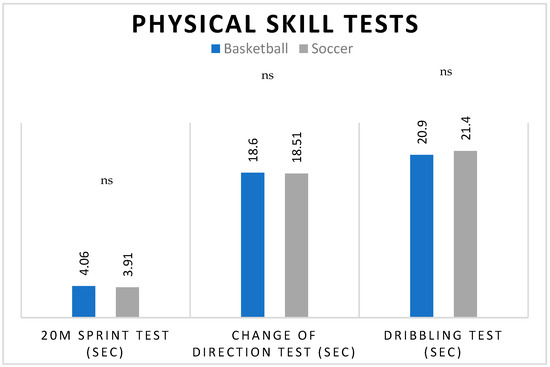The comparative pre-intervention mean scores of physical skill tests of basketball and soccer players. (ns = not significant).