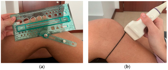 To perform the ultrasound, the subjects were placed supine with their knee flexed at 30 degrees and the muscles relaxed. The correct knee angulation was ensured using a goniometer (Figure 1a) [12,13].