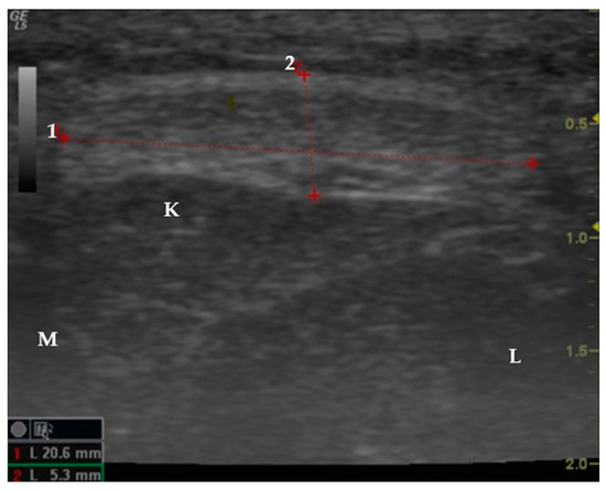 Subsequently, the transducer was rotated 90 degrees for a cross-sectional view to proceed with craniocaudal scanning. On this axis, we simultaneously obtained two measurements: width (1) and thickness (2) (Figure 3).