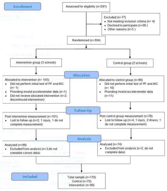 From the 281 children attending the five schools, 204 met the inclusion criteria and delivered written informed consent (105 children from the schools assigned to the intervention and 99 from the control schools). The final analysis included 170 children, 74 in the control group and 99 in the intervention group (Figure 1).