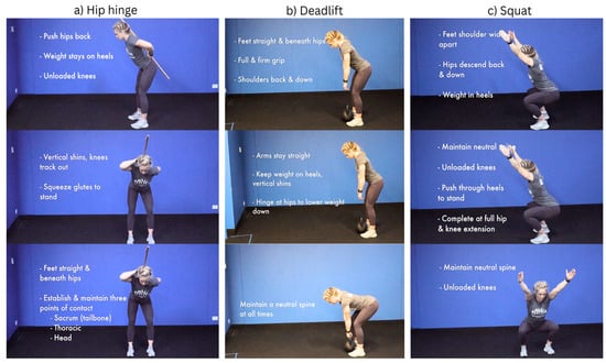 Over the eight weeks of movement therapy, coordination increases steadily with less requirement for correction and improved cadence or speed of tasks, range of motion, duration, and power. Patients receive specific guidance and participate actively and repetitively in movement drills that promote the development of default motor patterns that express movement proficiency for daily living and bending activities, characterized by hip-centric rotation with neutral spine awareness in the presence of an active posterior kinetic chain. These movement characteristics eliminate knee loading and anterior chain-dominant movement, such as kneeling, which inherently deactivates the posterior kinetic chain, promoting a loss of undesirable stable and neutral spinal positions (see Figure 2) [15,28,38].