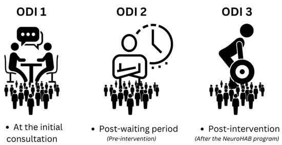 A single neurosurgeon referred all patients in the study to one of two rehabilitation centers offering NeuroHAB for chronic low back pain. This has been the usual standard of care for the referring clinician since 2015. Over the four-year period between 2019 and 2023, 290 patients participated in NeuroHAB Functional Movement Therapy and completed the necessary pre- and post-NeuroHAB intervention ODI assessments. ODI scores were collected on three occasions across the span of this study: one at the first consultation with the referring neurosurgeon, a second at the commencement of the NeuroHAB Functional Movement Therapy intervention, and a third and final after the eight-week intervention. The time period on the waiting list to commence the NeuroHAB intervention varied between 3 weeks and 3 months. From this data, a “waiting list” control–comparison group change in average ODI score was calculated. Absolute improvements in average ODI scores were observable by the comparison of post-intervention ODI 3 with pre-intervention ODI 1 and ODI 2. Patients remained under their own control while receiving usual care on the “waiting list” before the NeuroHAB Functional Movement Therapy intervention. ODI 1 is representative of the ODI score each patient received upon the first consultation. ODI 2 is representative of the ODI score each patient received after the waiting period and immediately before the intervention, and ODI 3 is representative of the ODI score given after NeuroHAB, post-intervention (see Figure 3). No patient demonstrated competency in NeuroHAB-defined movement proficiency at the commencement of the intervention.