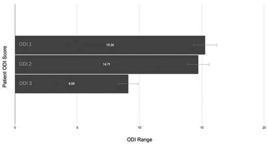 Descriptive statistical calculations were conducted for an overall view of the data. The average ODI 1 score (consultation) was 15.26 ± 6.1% (CI: 14.3–16.2), ODI 2 (waitlist/pre-intervention) was 14.71 ± 6.0% (CI: 13.82–15.59), and ODI 3 (post-intervention) was 9.09 ± 8.6% (CI: 8.305–9.875) (see Figure 4).