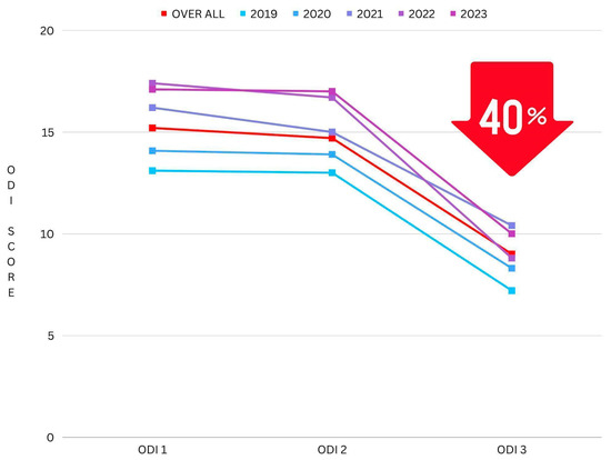 A reduction percentage was calculated between the ODI data and categorized yearly to further illustrate the significant changes in mean values.