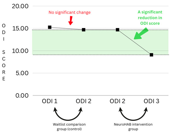 This study was designed to utilize patients’ ODI scores from their first meeting (consultation) and contrast those with their ODI scores from after the waiting period and just prior to the commencement of the program. Each patient was required to wait an undisclosed period of time prior to starting the program; these ODI numbers serve as a control-like comparison group, as we can compare and contrast the ODI numbers of patients waiting (receiving no treatment) vs. those after the NeuroHAB program (the patient has finished treatment). For the purpose of this study, it is called the waitlist comparison group. Below, you can see there is no significant change from ODI 1 to ODI 2 (scores taken from the consultation vs. after the waiting period, before NeuroHAB). This was when the patient was on the waiting list. ODI 2 and ODI 3, however, display significant results, including a clear reduction in the ODI score, which represents a reduction in pain and disability. This change can be contrasted with the waitlist comparison group, which had no significant change at all. This is a clear indicator of the results retrieved from this research (see Figure 7).