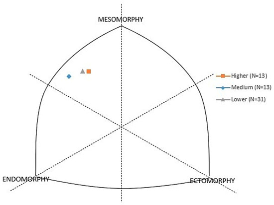All measurements were conducted following the International Society for the Advancement of Kinanthropometry (ISAK) protocol [28] on the dominant side of the body, as suggested in the original instructions for using the Heath–Carter method for somatotype calculation [1]. Moreover, the subjects were measured by using the Tanita BC-418 (Tanita Corp., Tokyo, Japan) device, which uses a constant current source with a high frequency current (50 kHz, 90 µA), following the recommendations given by Kyle et al. [29]. The method of bioelectric impedance was used to determine the results of the following morphological measures: body mass, fat range, muscle mass, trunk muscle mass, arms muscle mass, legs muscle mass, fat mass, trunk fat mass, arms fat mass, and legs fat mass. The subjects took the BIA measurement barefoot and only in dry underwear. All jewelry, watches, or any other pieces of clothing were taken off. The GMON software was used to conduct measurements where the “body type” value was set for all subjects to “sports mode” and the “clothing weight” value was set to 0.0 kg.