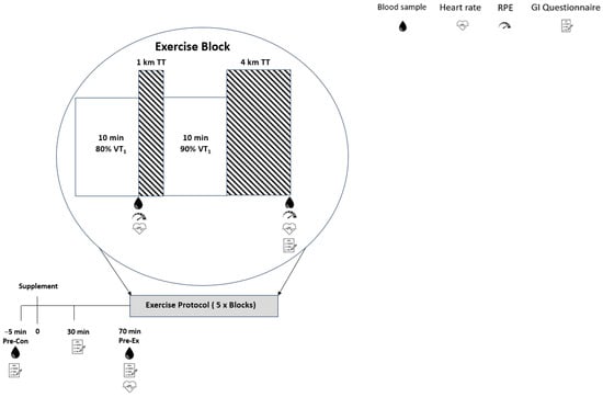 Anthropometry was recorded, including height (to the nearest 0.01 m; Seca 217 stadiometer, Seca; Hamburg; Germany), body mass (to the nearest 0.1 kg; Seca 761 scales, Seca, Hamburg, Germany), and body composition using bioelectrical impedance (Bodystat Ltd., Isle of Man, British Isles). Exercise was performed using an electromagnetically braked cycle ergometer (Excalibur Sport; Lode, Groningen, The Netherlands). The positions of the saddle and handlebars were replicated for all trials. The participants wore a facemask (model 7940; Hans Rudolph, Kansas, MO, USA), and O2peak and pulmonary gas exchange variables were measured breath-by-breath (Version 3B, Cortex Medical, Leipzig, Germany). Fingertip capillary blood samples were collected pre supplement consumption, pre exercise, and pre and post each exercise block (Figure 1) using 70 μL balanced heparin blood capillary tubes (Radiometer, Copenhagen, Denmark). Blood samples were immediately analysed (ABL90 Flex; Radiometer, Copenhagen, Denmark) for their concentrations of lactate [La−], glucose [glucose], bicarbonate [HCO3−], haemoglobin [Hb], potassium [K+], sodium [Na+], calcium [Ca2+], and chloride [Cl−], along with the pH and partial pressure of carbon dioxide PCO2. The hydrogen ion concentration [H+] was derived from the measured pH as the antilog. The strong ion difference ([SID]) was calculated as the sum of the strong ions minus the sum of the strong anions: [SID] = ([Na+] + [K+] + [Ca2+]) − ([Cl−] + [La−]) [,]. Changes in the blood volume from baseline were calculated from the changes in [Hb] []. Heart rate was measured continuously via telemetry (Sigma ID. GO, Sigma-electro, Neustadt, Germany). Ratings of perceived exertion (RPEs) were recorded using the Borg scale (6–20) [], immediately before (pre) and within the last few seconds (post) of each exercise block. Gastro-intestinal tolerance was assessed using a questionnaire based on previous studies [,]. The participants rated their level of gastro-intestinal intolerance using a Likert scale, assessing the symptoms of nausea, flatulence, stomach cramping, belching, stomach ache, bowel urgency, diarrhoea, vomiting, and stomach bloating. The participants indicated the severity of each symptom on a scale from 0 to 10, with 0 being “no symptom” and 10 being “severe symptom”. These severity ratings were recorded pre supplement consumption, 30 min post supplement consumption, immediately pre-exercise, and immediately after each exercise block. The time to complete the exercise protocol, which served as the primary outcome of the study, was recorded using the Lode Ergometry Manager 10 Software (Lode, Groningen, Germany).